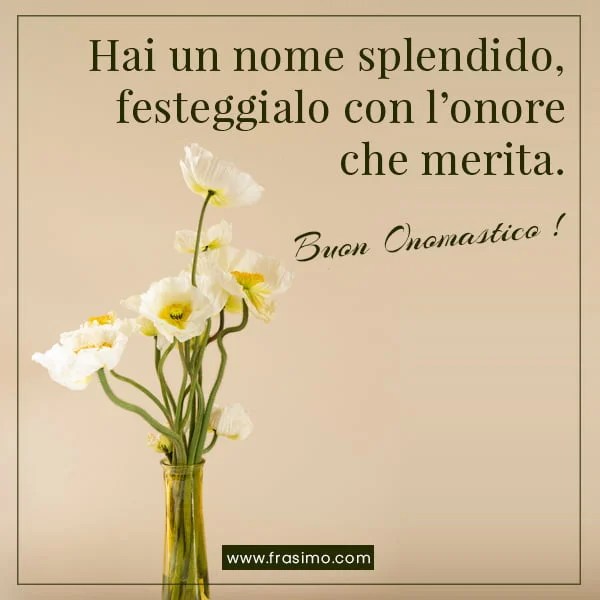 Ogni mio sorriso porta il tuo nome.. Non tutti amano festeggiare l'onomastico, anzi, è una tradizione maggiormente diffusa al sud italia, ma chi lo fa adora stupire i festeggiati con degli originali auguri di buon onomastico. Auguri frasi e immagini di buon onomastico 2020. Raccolta di frasi simpatiche per fare gli auguri di buon onomastico. Pensieri di buon onomastico accompagnati da belle immagini per augurare buon onomastico. Ecco alcuni esempi di messaggi che potresti usare. Ti porterò su una stella e le darò il tuo nome, ma piccola … Porto il tuo nome è inciso nel mio cuore. Leggi tutte le simpatiche frasi onomastico e scegli la … Quasi sempre ci capita di fare gli auguri per l'onomastico del giorno che, come il compleanno, è un'occasione per festeggiare una persona. Ti svegli un giorno e ti rendi conto che questo giorno è più speciale di altri giorni … è l'onomastico del mio migliore amico!.. Auguri di buon onomastico offre tutto quello che serve per fare bellissimi auguri di onomastico.sono state raccolte tante frasi di buon onomastico che potrai scrivere sui biglietti o mandare per sms.